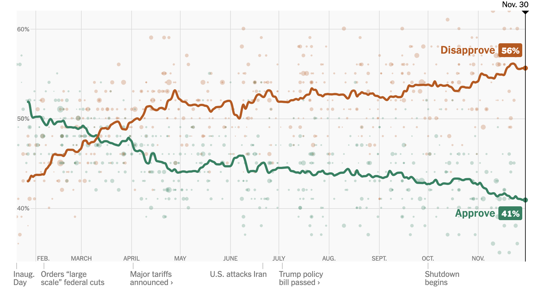 Trump pays attention to these numbers, as do Republicans running for re-election, which may be why many have begun to question or even defy him. Trump himself has gotten increasingly shrill, giving off more than a whiff of desperation. It is unlikely that calling a reporter “piggy” or cozying up to Zohran Mamdani will alter this trend for the better.